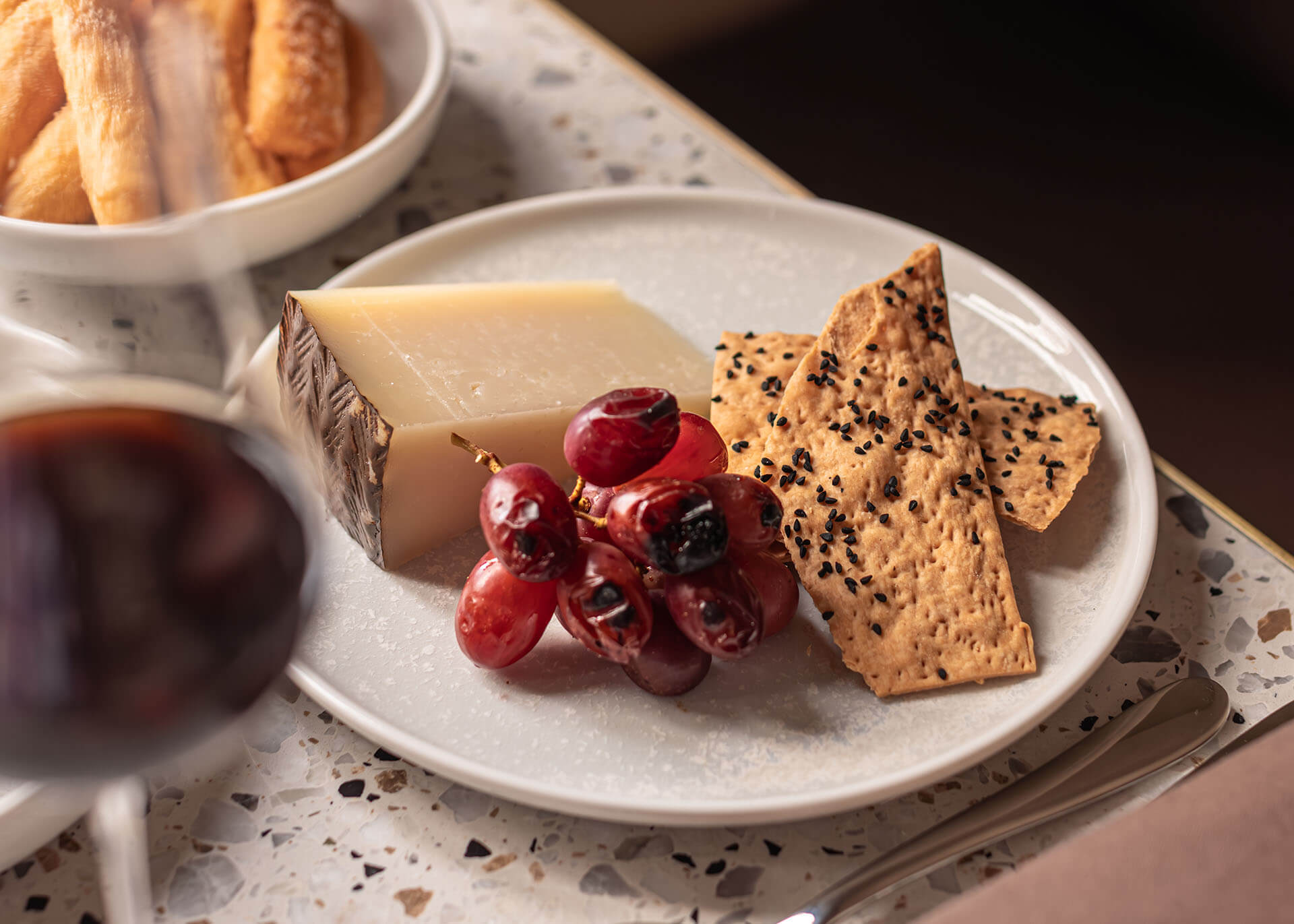 Black garlic, manchego + potato crisp